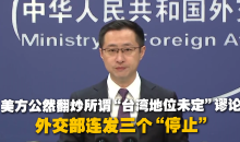 美方公然翻炒所谓“台湾地位未定”谬论,外交部连发三